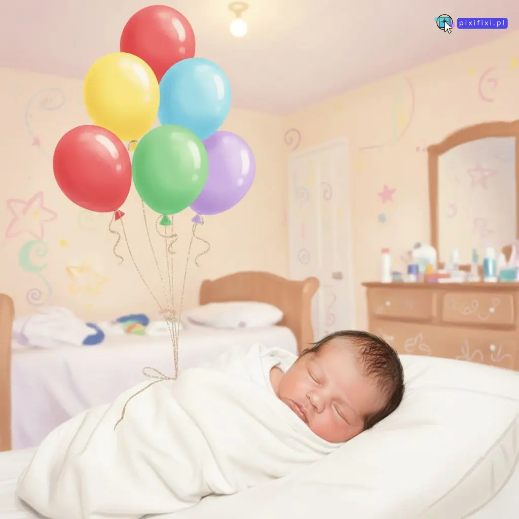 Oto przykład z zastosowaniem promptu: „Przerób zdjęcie na sesję dziecięcą w stylu bajkowym, z kolorowymi balonami.”